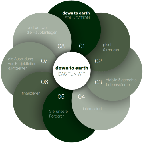 «Sei du selbst die Veränderung, die du dir für diese Welt wünschst.» Die Veränderung, welche die «down to earth FOUNDATION» zum Ziel hat, wird schon jetzt von einer Gruppe von Expertinnen und Experten für Nachhaltige Entwicklung, Umweltingenieuren, Biologen, Technologen, Experten für nachhaltige Energiegewinnung, Architekten, Planerinnen und Planer getragen und aufgebaut.